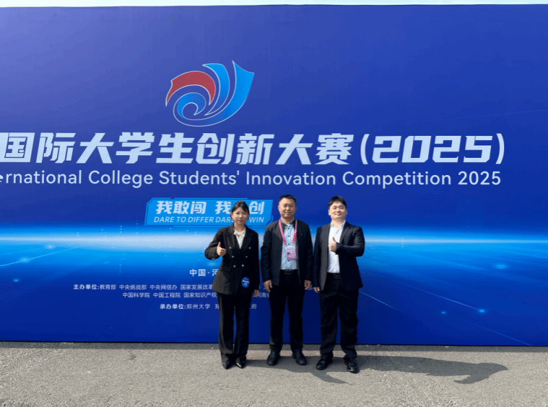 【指導(dǎo)老師劉平勝(中)、項(xiàng)目創(chuàng)始人陳高程(右)、團(tuán)隊(duì)成員任琪(左)在決賽現(xiàn)場(chǎng)合影】