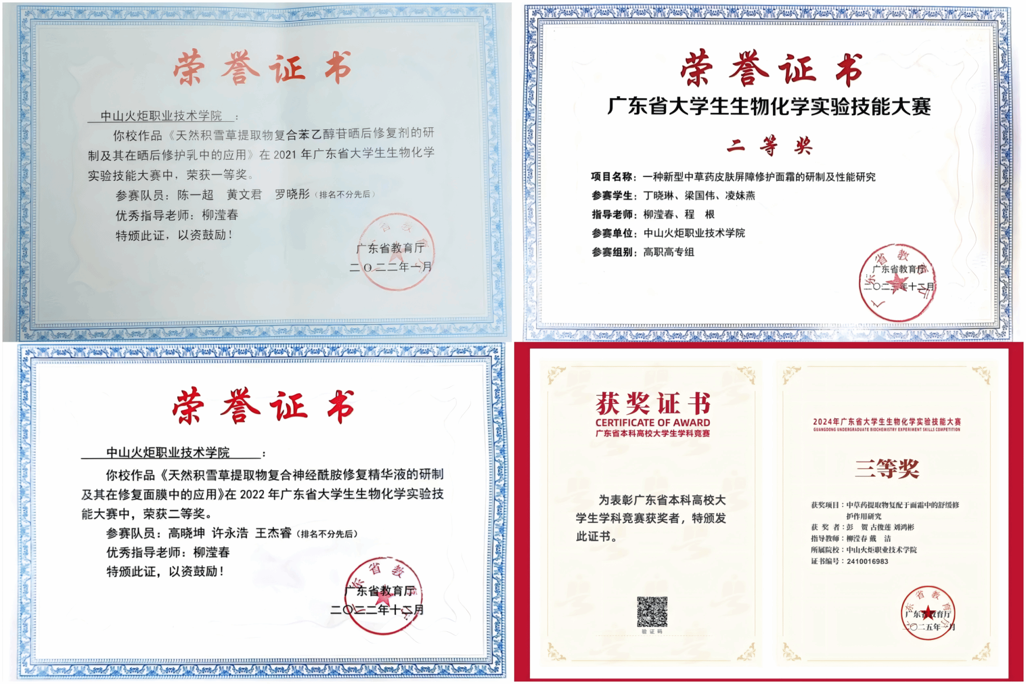 近年來,該工作室在化妝品技術相關賽事領域始終表現亮眼:去年第六屆硅碳鼠超級配方師大賽,4名同學晉級護膚賽道百強、2名同學晉級洗護賽道百強,更有1人闖入全國30強配方;此外,同學們還組團參加廣東省生物化學實驗技能大賽、全國化妝品配方師技術職業技能大賽等賽事并屢獲佳績,充分印證了其專業能力的培養實力。