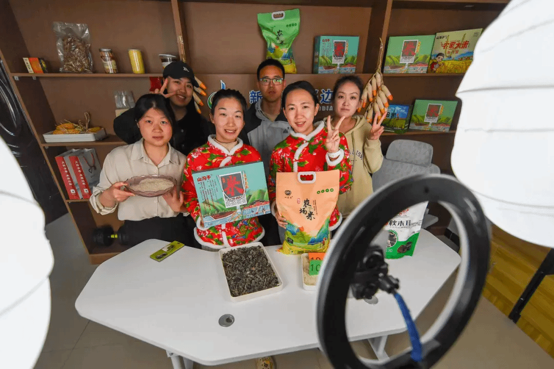 ▲ 在吉林省延邊朝鮮族自治州琿春市楊泡滿族鄉的東阿拉村,網絡主播向直播間的觀眾介紹著手中的大米。新華社記者 張楠 攝
