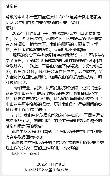 11月8日,河南U18女籃隊因隊員的比賽球衣遺落酒店,向十五運會志愿者和公安干警求助。來自我校的志愿者迅速協調,公安干警馬上用警車護送教練取回球衣,全程僅用了28分鐘,確保球隊順利參賽。河南隊對志愿者和公安干警的專業高效服務表示誠摯感謝,盛贊他們展現了全國文明城市的魅力與溫度,也讓球隊對十五運會各項保障工作充滿信心。
