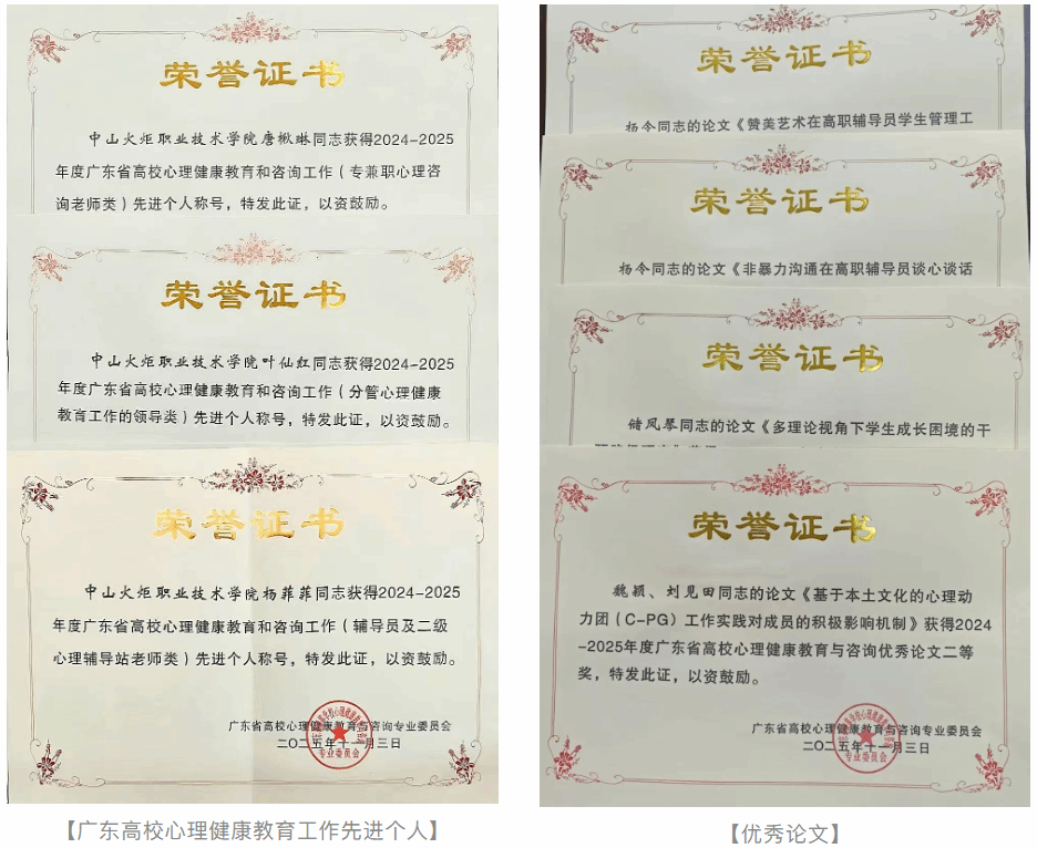 11月3日至4日,2024-2025年廣東省高校心理健康教育與咨詢專業委員會會員大會暨學術年會在中山召開。本次年會以“以優秀傳統文化與人工智能推進高校心康工作高質量發展”為主題,深入落實《教育強國建設規劃綱要(2024—2035年)》要求,總結全省高校心康工作成效。我校憑借系統完善的工作體系與突出的實踐成果,在此次評選中收獲佳績,具體獲獎情況如下: