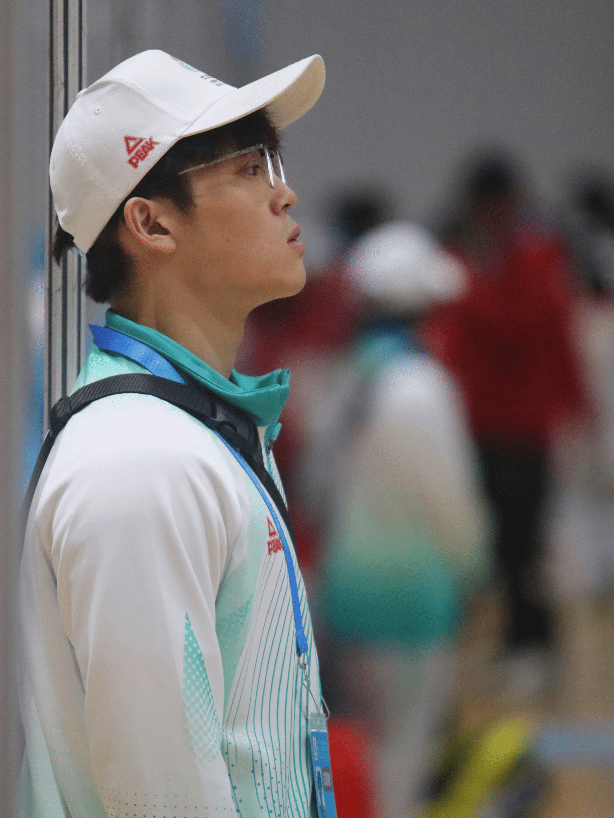 這一溫情瞬間的主人公之一,是20歲的寇家橦,來自我校光電信息學院通信242班的一名“小海豚”志愿者。彼時正處在300米和1000米決賽的間隙,剛順利比完所有項目的廣東二團小將廖羽恒、陳欽麟和喬揚靖回到了休息區。300米決賽的穩定發揮讓孩子們松了口氣,也完全恢復了爛漫的天性。他們朝著休息區旁值守的寇家橦撲去,親昵地張開雙臂,示意:“請求起飛”。