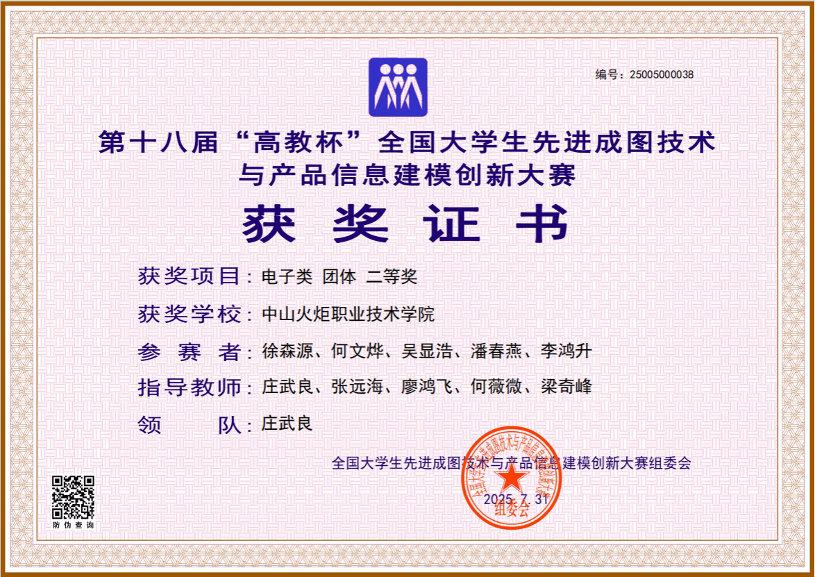 這份榮譽的背后,更凝聚著指導教師團隊的默默耕耘與無私付出,也是在黨建引領下,光電信息學院作為我校第二期“雙高”建設主要參與單位,持續推進“雙師型”教師隊伍培育成效的直接體現。由莊武良、張遠海、廖鴻飛、梁奇峰、何薇微、袁夫全、楊立宏、左紅英等應電專業老師組成的指導團隊,全程深耕競賽指導工作。尤其是莊武良、張遠海老師多年來全身心投入競賽組織與賽前培訓,犧牲大量個人時間,從省賽備賽到國賽沖刺,為學生制定精細化訓練方案,針對技術難點開展一對一輔導;其他教師各司其職、協同發力,在模型搭建、圖紙繪制等關鍵環節為學生答疑解惑,陪伴學子攻克難關、突破自我,生動詮釋了“雙高”建設背景下教師隊伍的責任與擔當。