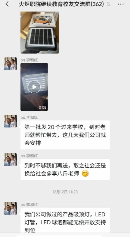 自我校選派繼續教育學院的李八斤老師到鳳凰鎮開展駐鎮鄉村振興幫扶工作以來,得到了廣大校友的持續關注與支持。李和紅校友表示,作為火炬職院培養的學子,他始終銘記母校“立德、明志、精業、惟新”的校訓,得知我校教師在鳳凰鎮開展駐鎮幫扶工作后,便迅速籌備適配鄉村場景的便攜式太陽能燈,希望以綿薄之力改善困難群體生活條件。同時他還表示,今后會繼續開展相關捐贈活動,感恩學校的培養和盡力回報社會。