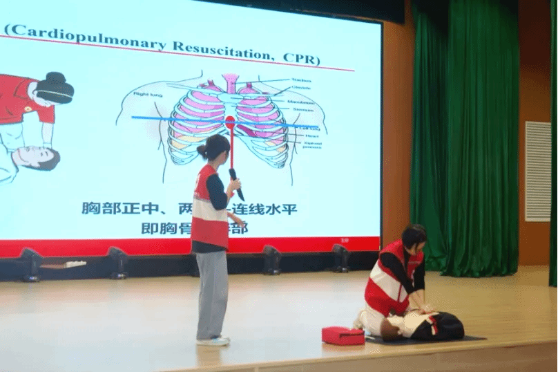 郭文清與張曼娜兩位老師結合自身豐富的急救培訓經驗,系統講解了心肺復蘇、氣道異物梗阻解除方法等高頻實用急救方法,還特別邀請同學們上臺實操演練。在問答環節,主持人圍繞此次培訓授課的核心知識點進行提問,同學們積極舉手搶答,現場氛圍熱烈有序,通過互動問答的形式有效鞏固了學習成果。