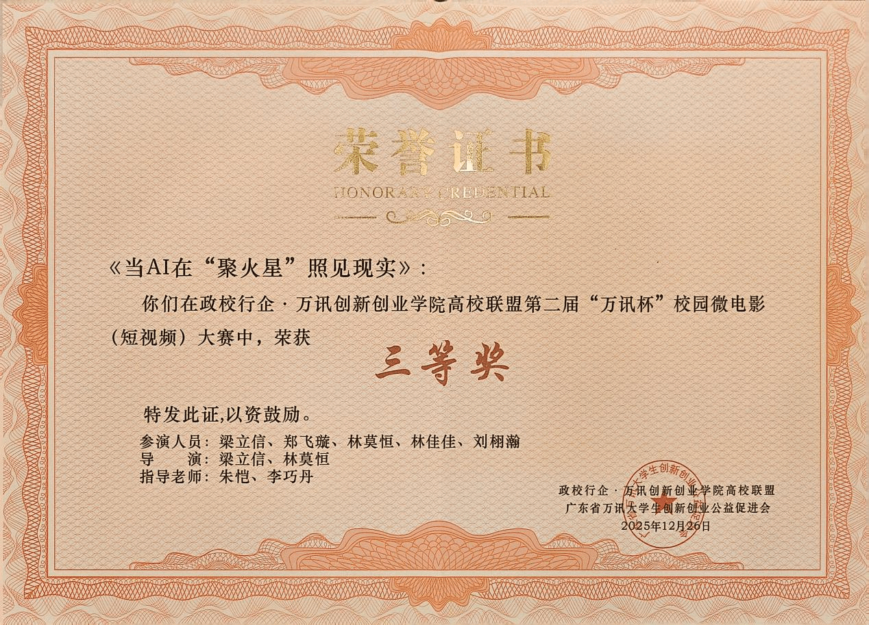 近日,政校行企?萬訊創新創業學院高校聯盟第二屆“萬訊杯”校園微電影(短視頻)大賽圓滿落幕。我校聚火星工作室創作的《當AI在“聚火星”照見現實》憑借鮮明的時代主題、扎實的專業呈現與亮眼的創新實踐,在全國高校選送的306部作品中脫穎而出,成功斬獲三等獎,用光影之力詮釋了黨建引領下“人工智能賦能教育發展”的生動實踐。