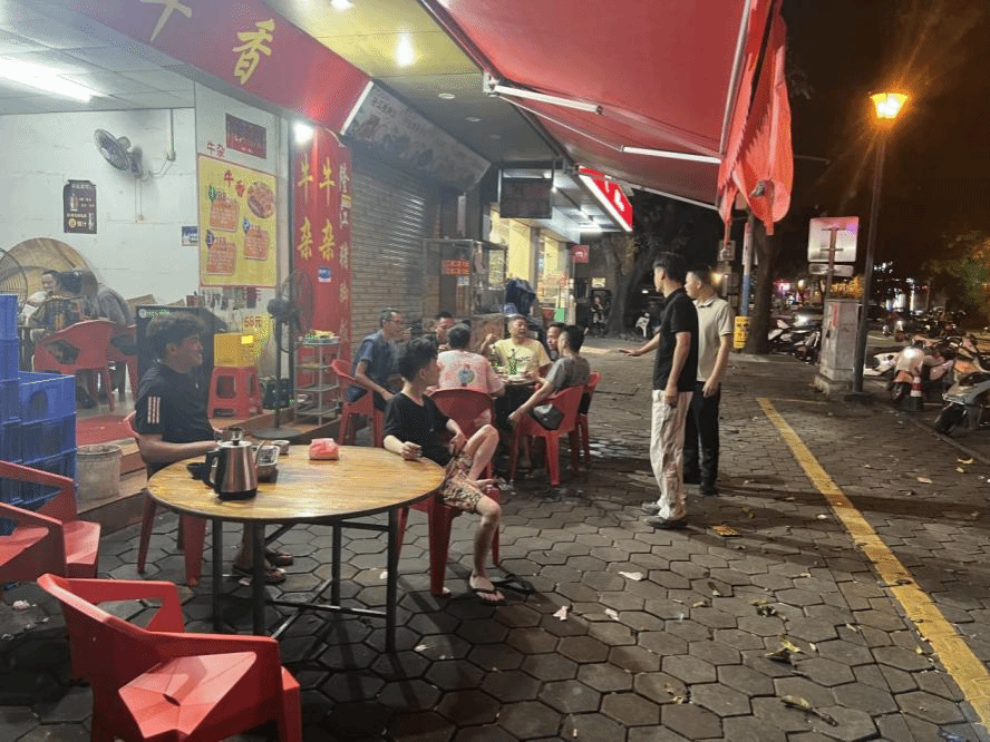 【賈昊楠(右二)在臺風前夕勸導食客盡快回家】