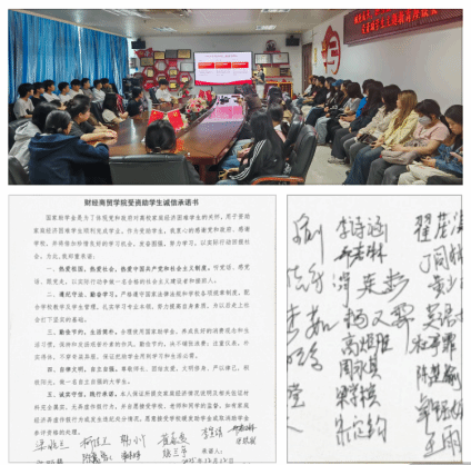 本次座談會,聚焦社會責任感、誠信感恩、反詐騙及金融常識,引導同學們樹立正確價值觀,增強社會責任感,積極投身志愿服務活動;聚焦誠信感恩教育,深入解讀資助政策中的誠信要求,結合典型失信案例,闡明失信行為對個人征信、學業發展的嚴重影響;聚焦誠信教育,強調誠信考試,要堅守誠信道德底線,考前認真復習,考場遵守考場規則與紀律。此外,還圍繞金融法治主題,系統講解征信知識、助學貸款還款流程及注意事項,剖析校園貸、電信詐騙等常見金融陷阱的作案手法與防范技巧,提醒同學們增強法治意識,理性規劃消費,守護自身財產安全。座談會尾聲,全體同學學習財經商貿學院受資助學生誠信承諾制度,并簽署誠信承諾書。全體受資助學生承諾將恪守誠信準則、心懷感恩之心、勇擔社會責任,勤奮學習、錘煉本領,努力成長為有理想、敢擔當、能吃苦、肯奮斗的新時代好青年。