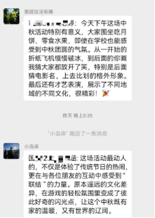 此次“月滿金秋,情聚校園”中秋節主題活動,既是學院黨建引領校園文化建設的生動實踐,也是深化“三全育人”“五育并舉”工作要求的具體行動。通過傳統文化浸潤與溫情互動結合,不僅強化了師生對中華優秀傳統文化的認同,更以“黨建+文化”“黨建+服務”的模式,搭建起師生溝通、中外交流的橋梁,切實提升了留校師生的歸屬感與幸福感。接下來,我院將持續以黨建為引領,緊扣學生成長需求,把傳統節日活動與思想引領、學風建設、國際交流等學生工作要點深度融合,不斷豐富育人載體、創新育人形式,為培養擔當民族復興大任的時代新人和講好中國故事的國際友人筑牢校園文化根基。