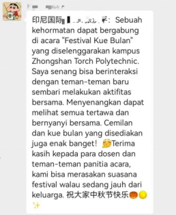 活動接近尾聲時,全體師生手持自制燈籠分享感受。來自印度尼西亞的留學生張同學表示首次在異國他鄉過中秋很溫暖很欣喜,留校學生來自云南的曹同學也感慨學院活動驅散了孤單。